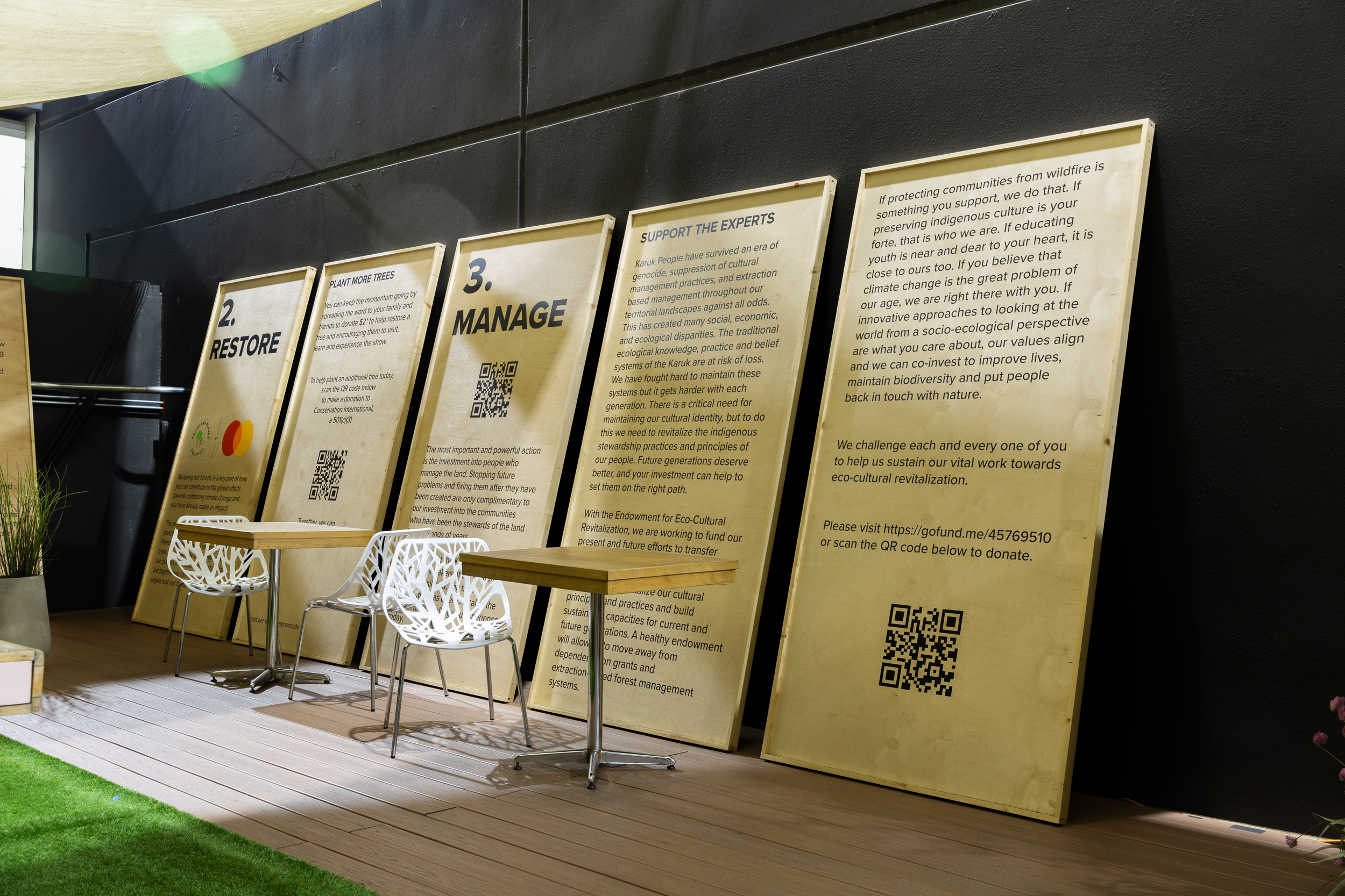 Floods of gradients that visually speak to the unearthing of human connection to nature were used for navigating the space; creating a cohesive visual language that the viewers can identify. In the case of the title wall, a white background was used to ensure accessibility and legibility in a dark, warm toned space.