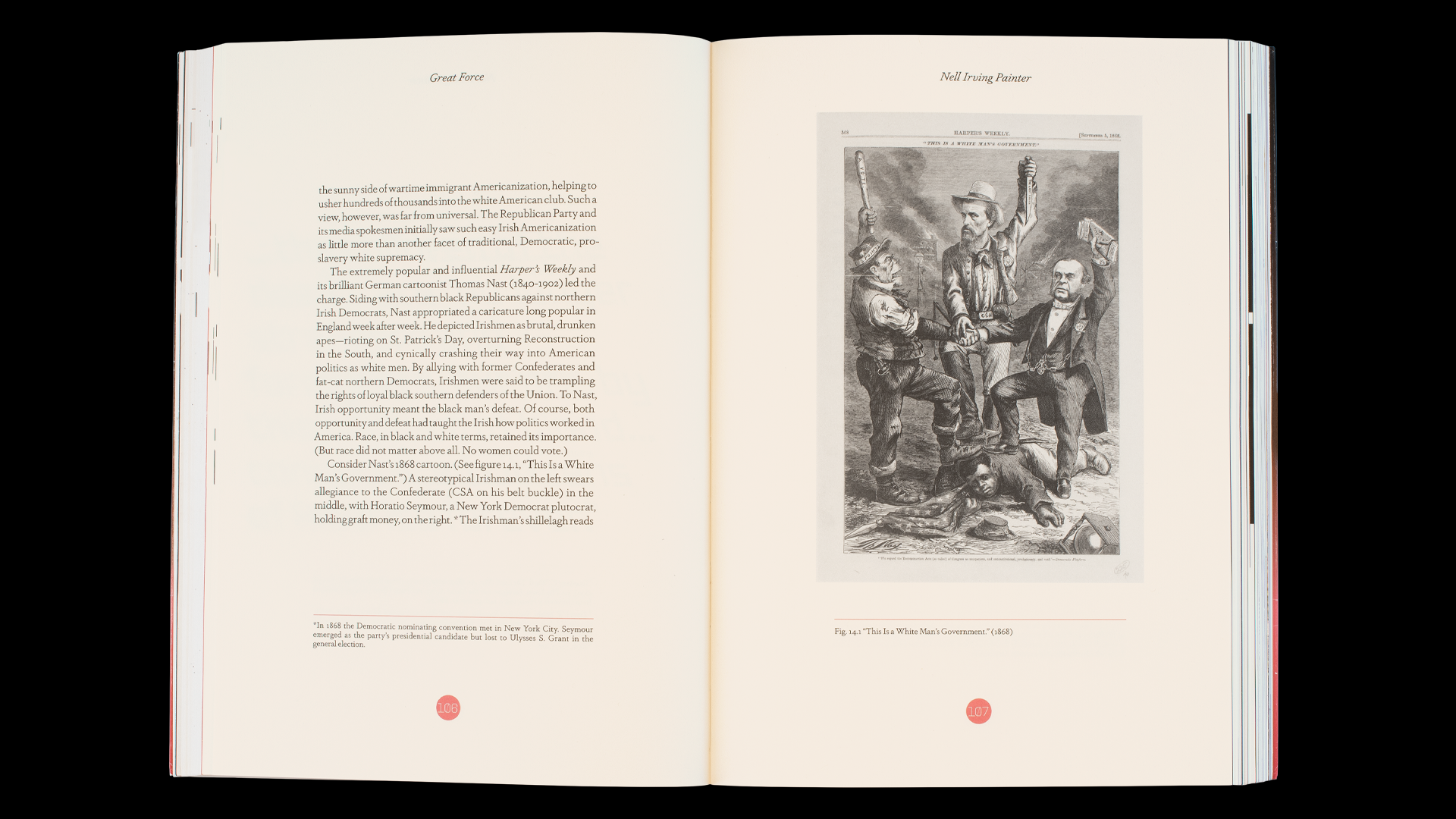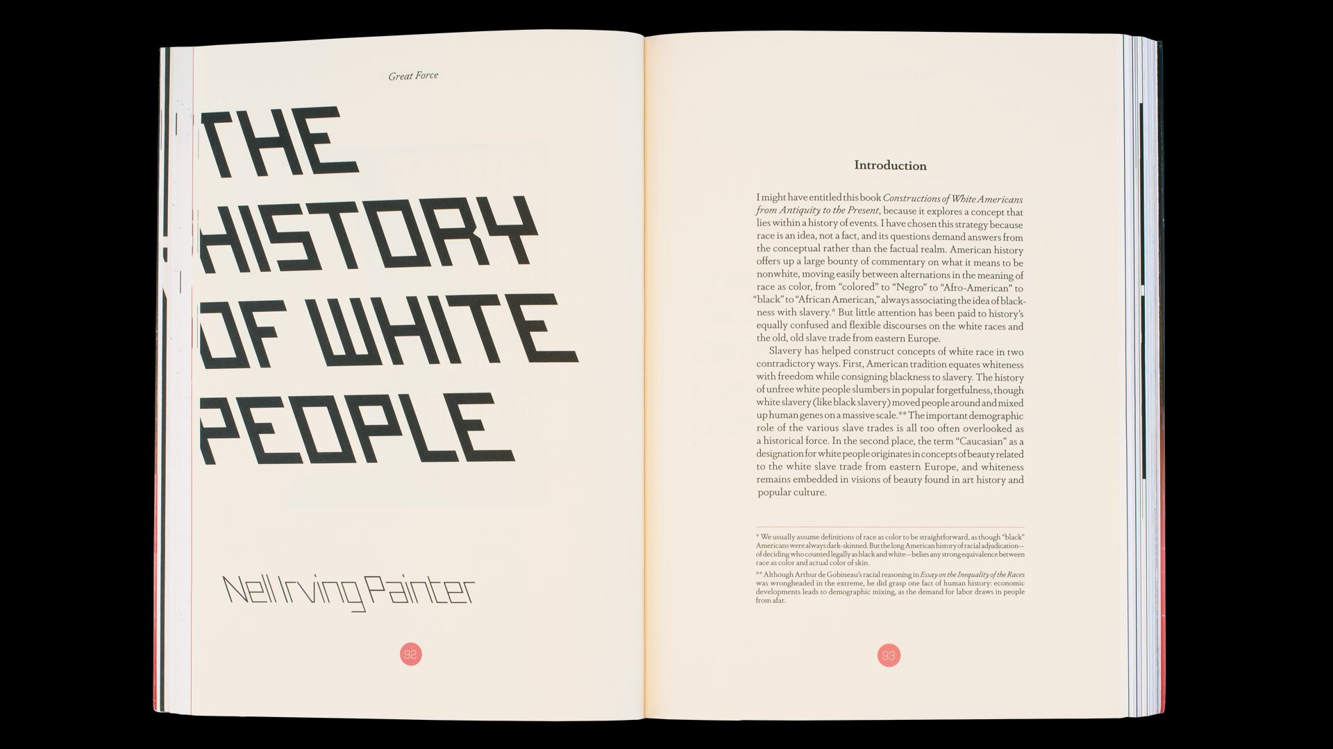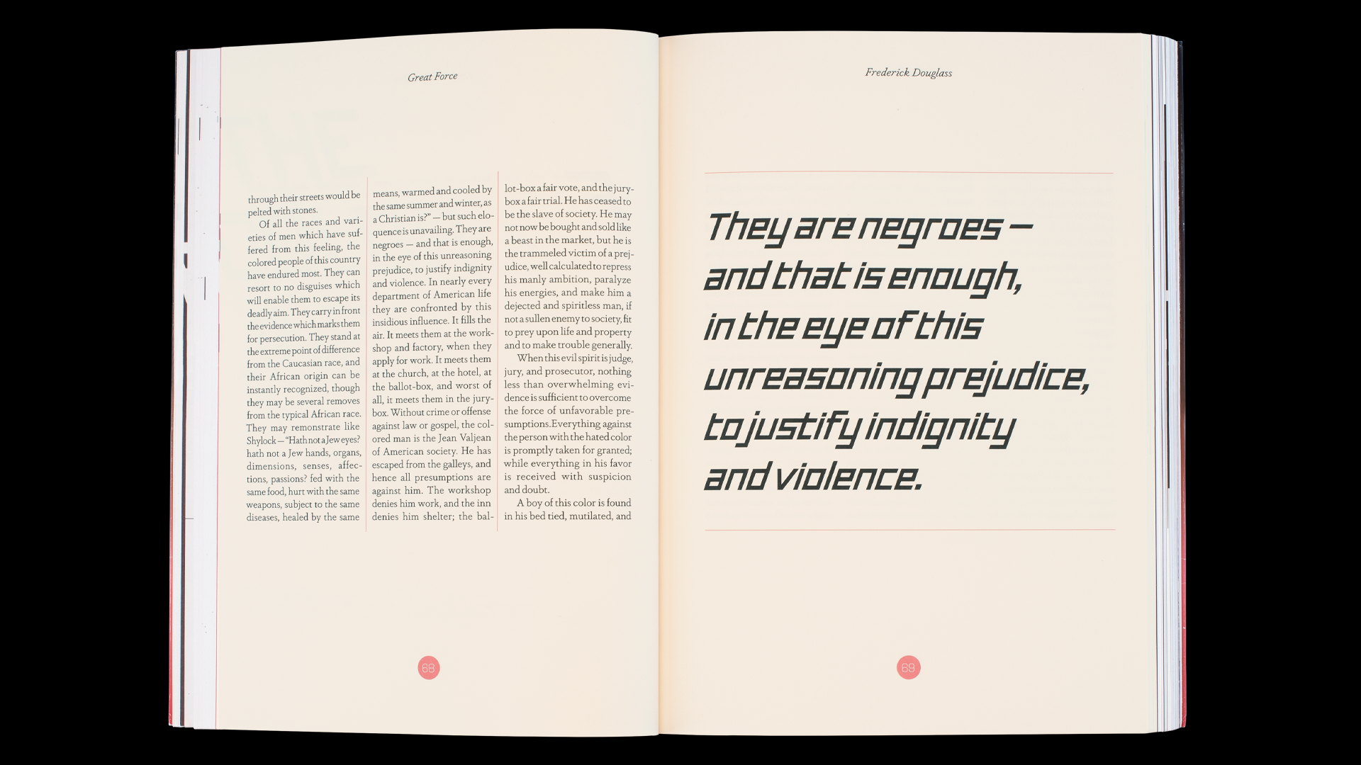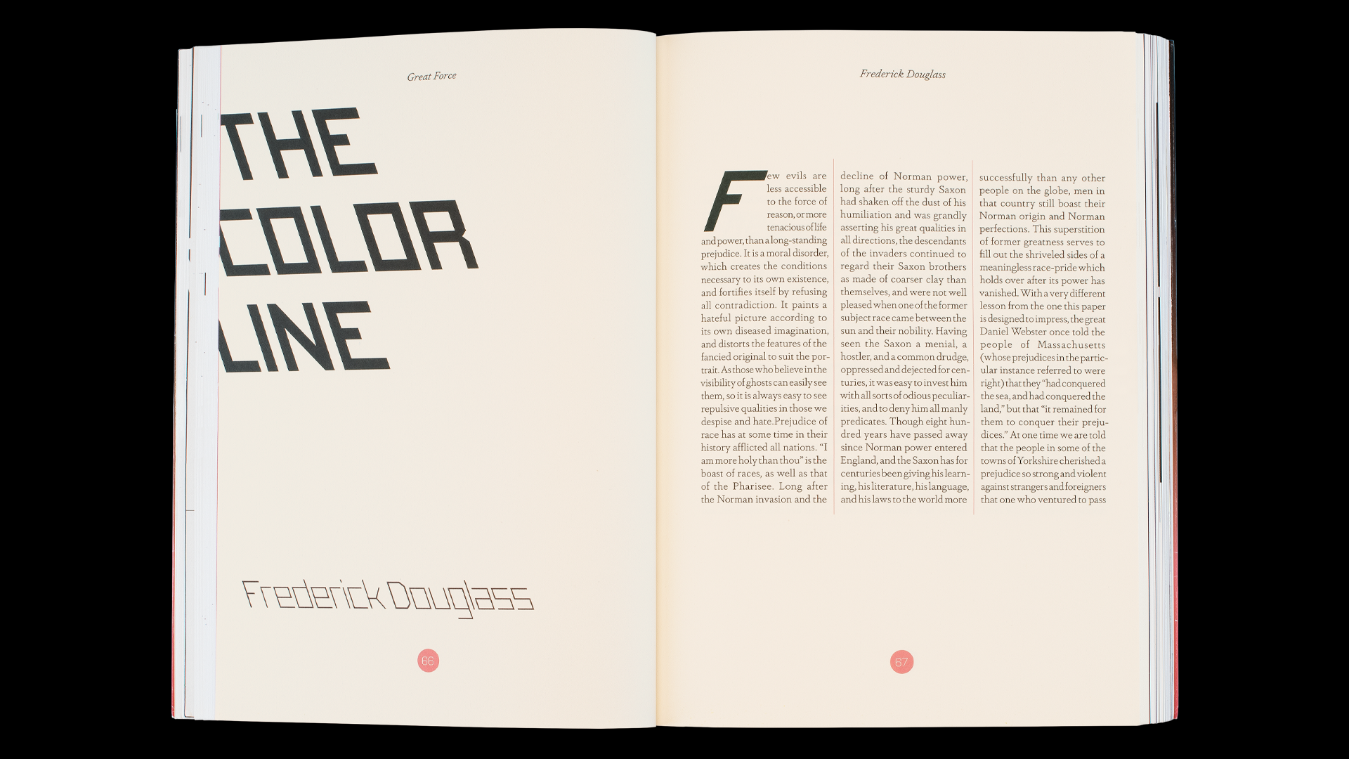 The exhibit Great Force gets its name from an essay written by James Baldwin about the force that racism has on the American psyche. The identity design remixes graphic data visualizations made by W.E.B. Du Bois and his team of Black students from Atlanta University for the World’s Fair in 1900. The exhibit Great Force gets gets its name from an essay written by James Baldwin about the force that racism has across a progression of time and its implications on the American psyche. The design for the identity is based on graphic data visualizations made by Du Bois and his team of Black students from Atlanta University for the World’s Fair in 1900. Polymode used a custom font created by Vocal Type based on stenciled lettering used in the poster series. This features a regular, bold, italic, and a back slant italic that is used to show the inordinate force of racism in America within the design. The color system of the book is based on the color palette of the diagrams referencing skin tone, colorism, pan-African colors, and a graphic abstraction used to attempt to transcend race and historic oppression. Each of the book’s sections consisted of a different colored paper; bright white, off-white, and natural white to question whiteness as a default state. The Great Force of racism and its implications on the American psyche are still with us.