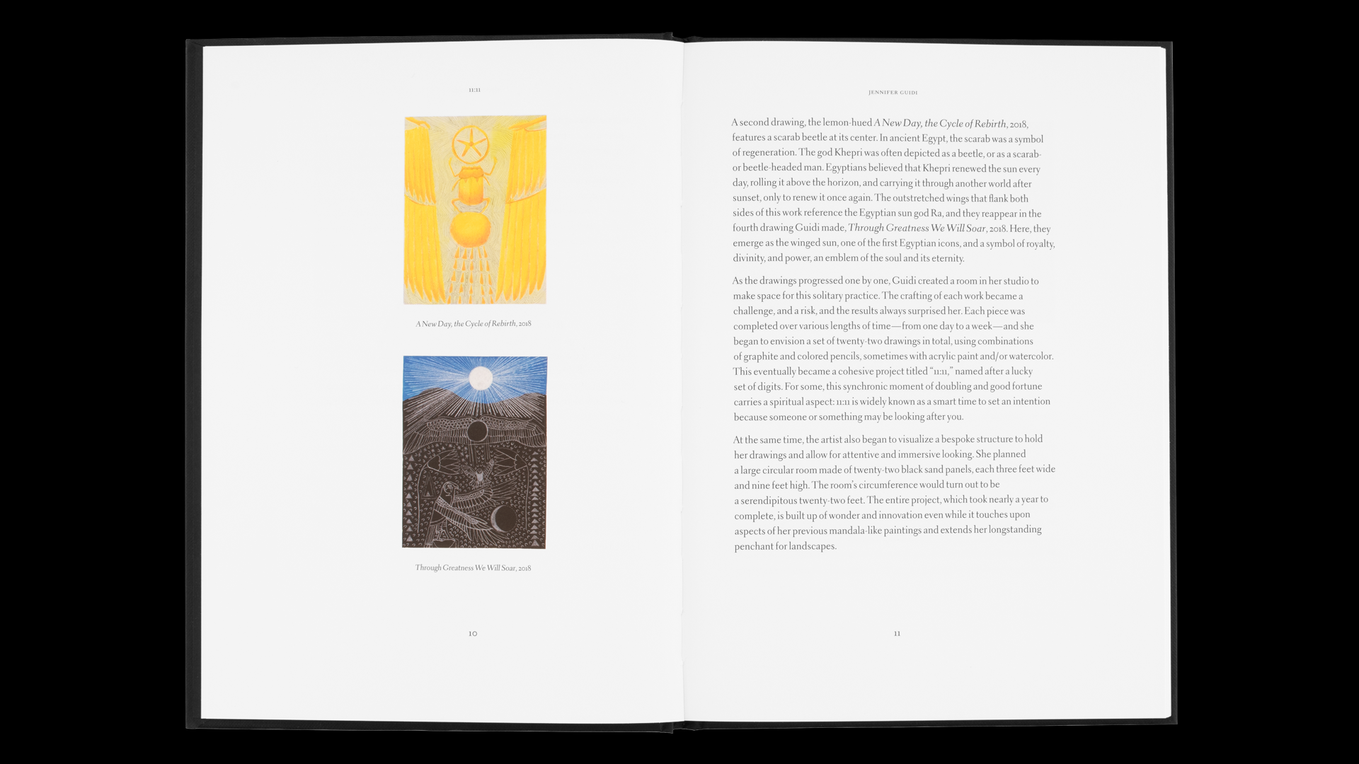 Jennifer Guidi’s book, 11:11, designed by Polymode and Published by David Kordansky Gallery is a hardbound volume that documents Guidi’s celebrated 2019 solo presentation at FIAC (Foire Internationale d’Art Contemporain). At the fair in Paris, Guidi displayed a cycle of 22 works on paper in a singular installation, an immersive experience focused viewing within the open, vaulted spaces of the Grand Palais. An illuminating essay by critic Lauren O’Neill-Butler offers insights into the artist’s universe of symbols, mark-making patterns, and color combinations, and explores Guidi’s first comprehensive body of works on paper in years.