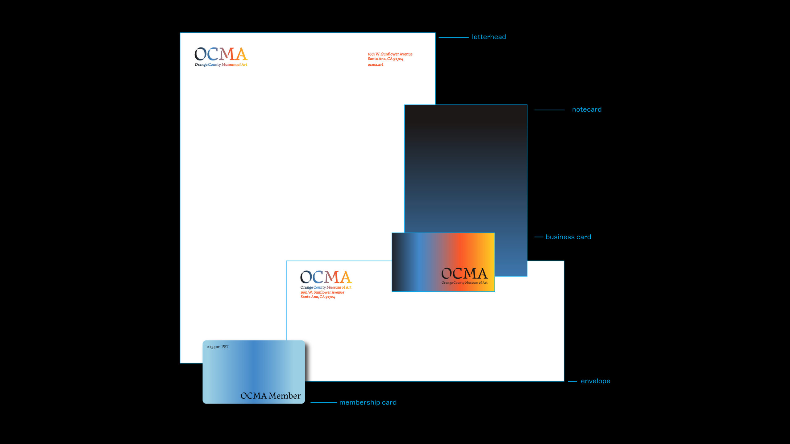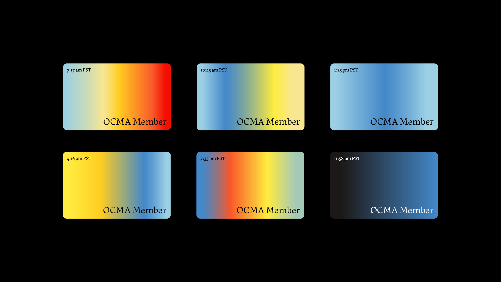 Southern California is a complex, multilayered place, connected to its ecological and geographical features – the sky, ocean, trees, and architecture. OCMA’s visual identity and website feature a dynamic design system that reflects the light and space of Southern California. The OCMA collection also features a strong representation of California art and the Light and Space movement.