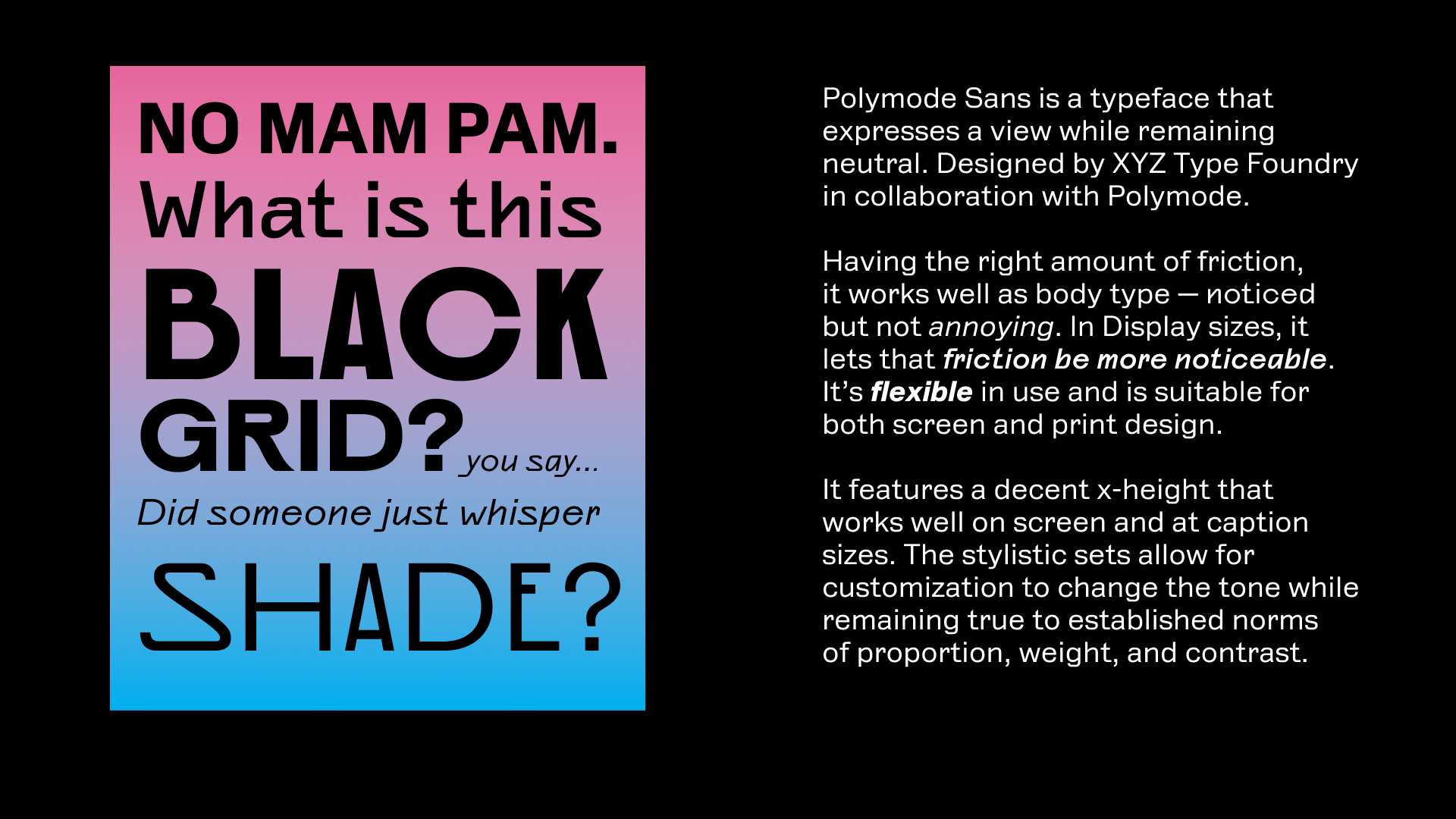 Polymode Sans is a typeface that expresses a view while remaining neutral. Designed by XYZ Type Foundry in collaboration with Polymode.