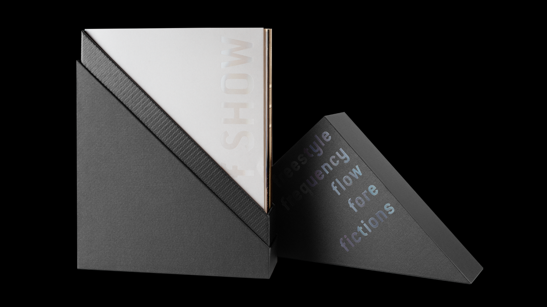 The sculptural and sleek forms of the box echo the materials and cantilevered aesthetics of the new architectural home for The Studio Museum designed by David Adjaye and Associates. The display typography, ITC conduit, set by the f SHOW brand takes on a new permanence foil stamped in a black iridescent finish. The box is accompanied by a printed pamphlet with a new introduction by Thelma Golden, an artist list from all shows, and matching iridescent foil-stamping.