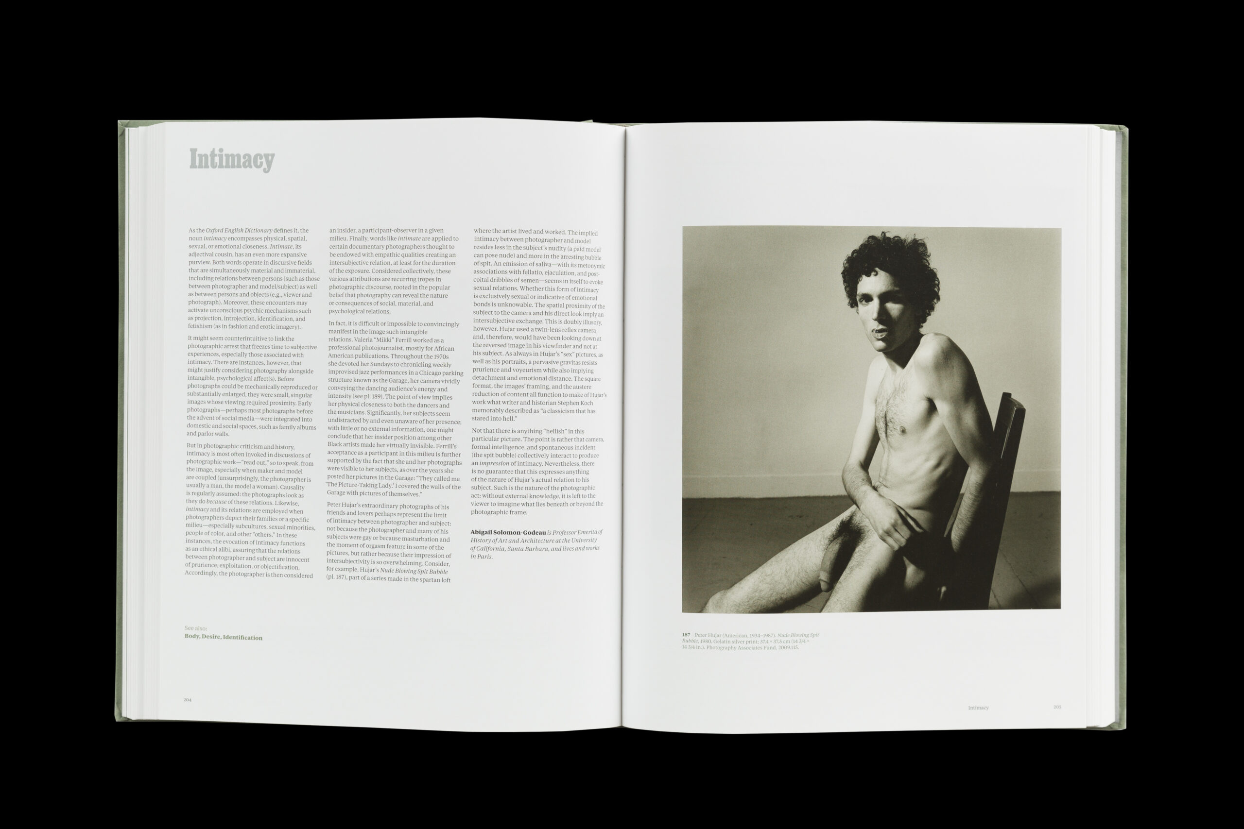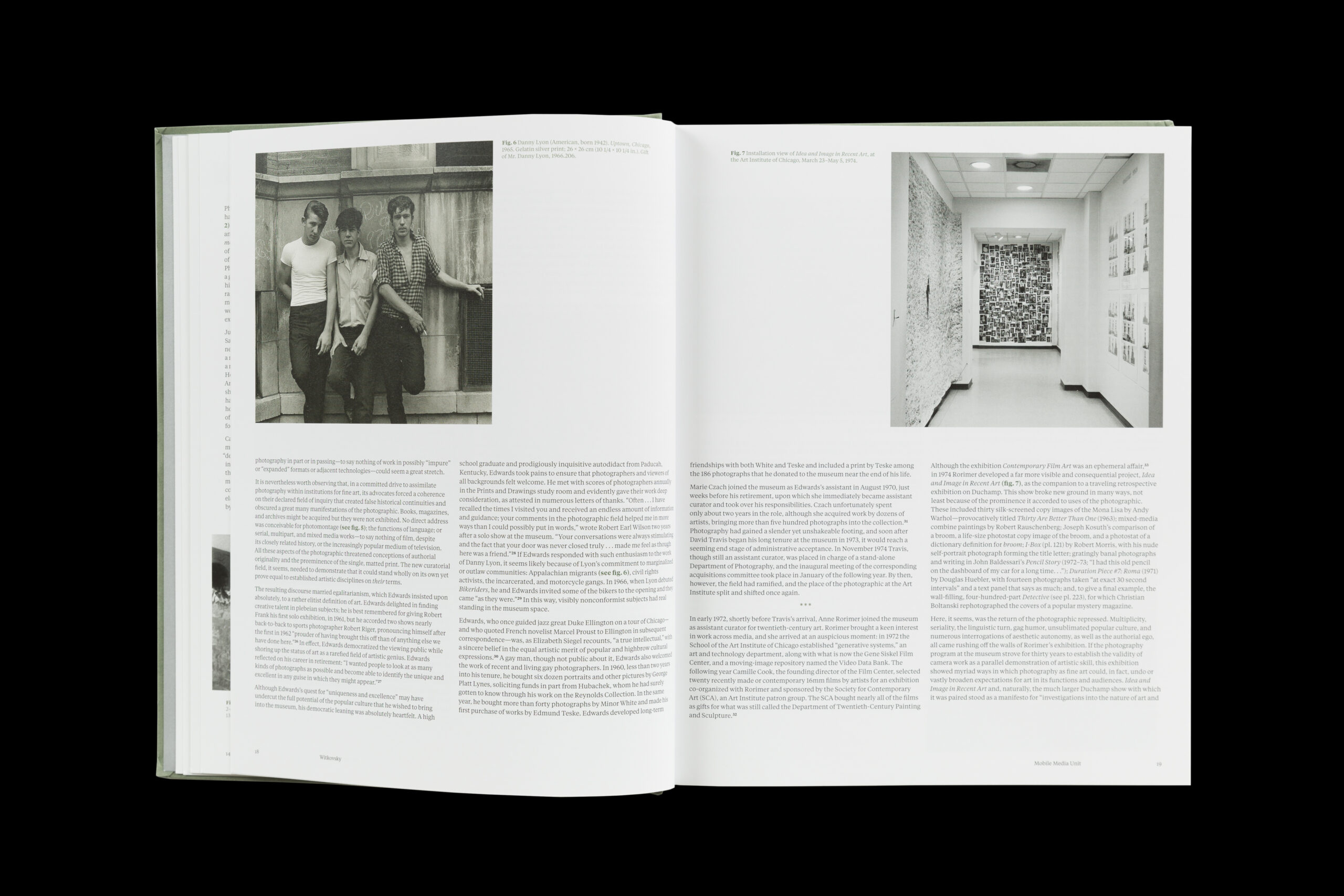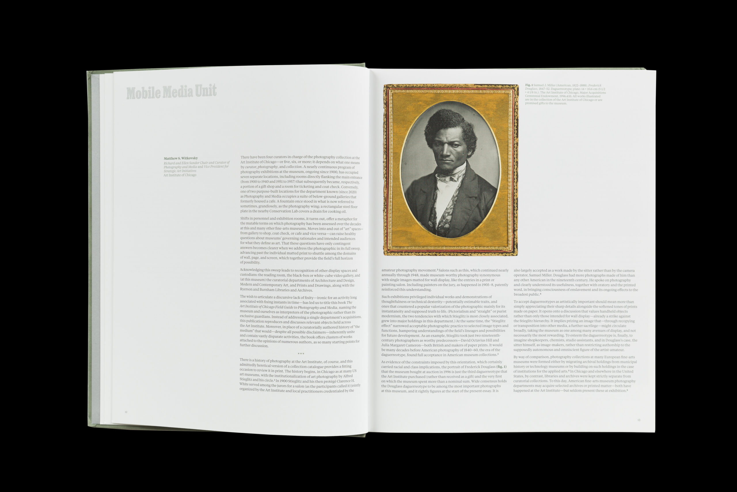 The Art Institute of Chicago Field Guide to Photography and Media was designed and inspired by the textures and feeling of daguerreotypes, which was the first publicly available photographic process. With that in mind, the cover uses a velvet like texture with debossed silver type to mimic what was traditionally found on these daguerreotypes.