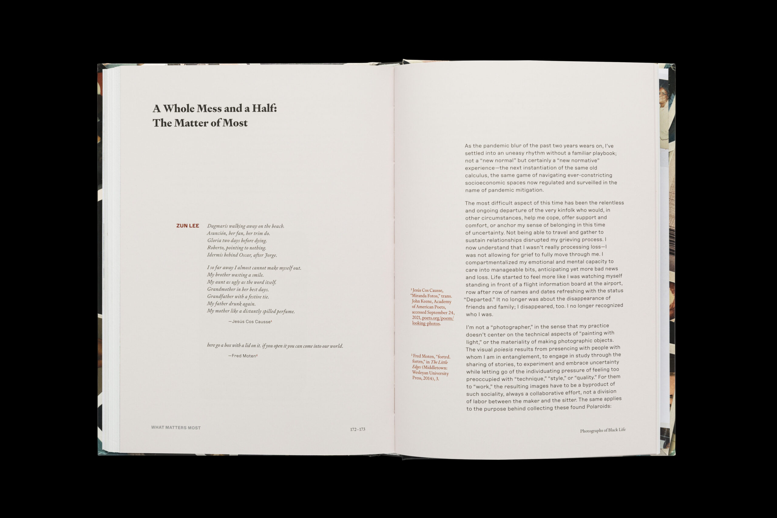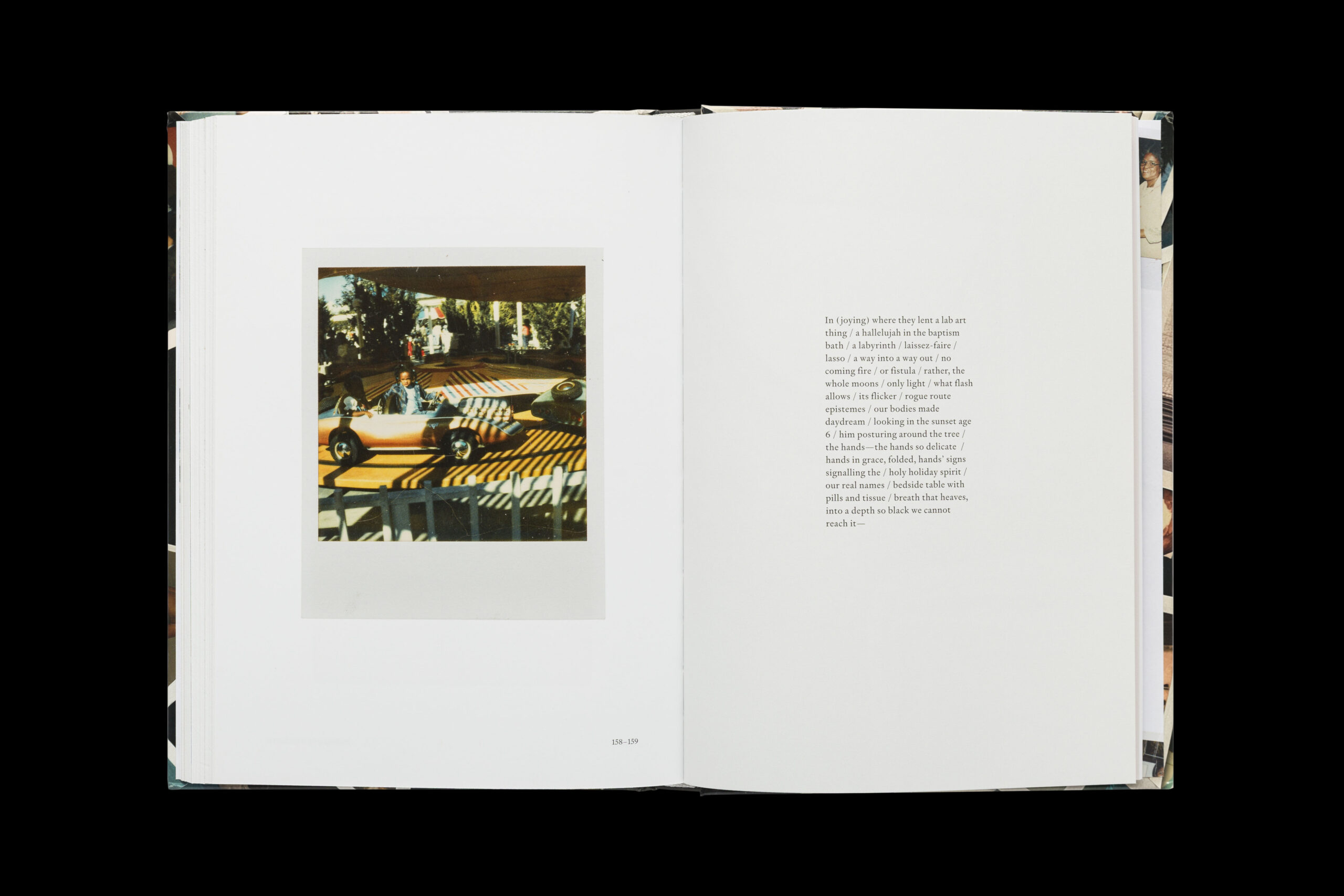 The placement of the Polaroids on each page generates discussion, imagination, and connection through similarities in colors, gestures, and places. The design allows for open interpretation; giving the reader a chance to to make their own associations. The size of the publication offers a more personal and intimate experience; inspired by looking through family archives and photographs. While the book itself has a flow and rhythm to it, readers are encouraged to dig into their intuition as they flip through the pages. The layouts of interspersed Polaroids offer several entries into the book: moments of immersive full bleed images, a messy collection on a countertop, polaroids that line up to the grid, and images that speak to the adjacent poems become an interlude of reflection between texts.